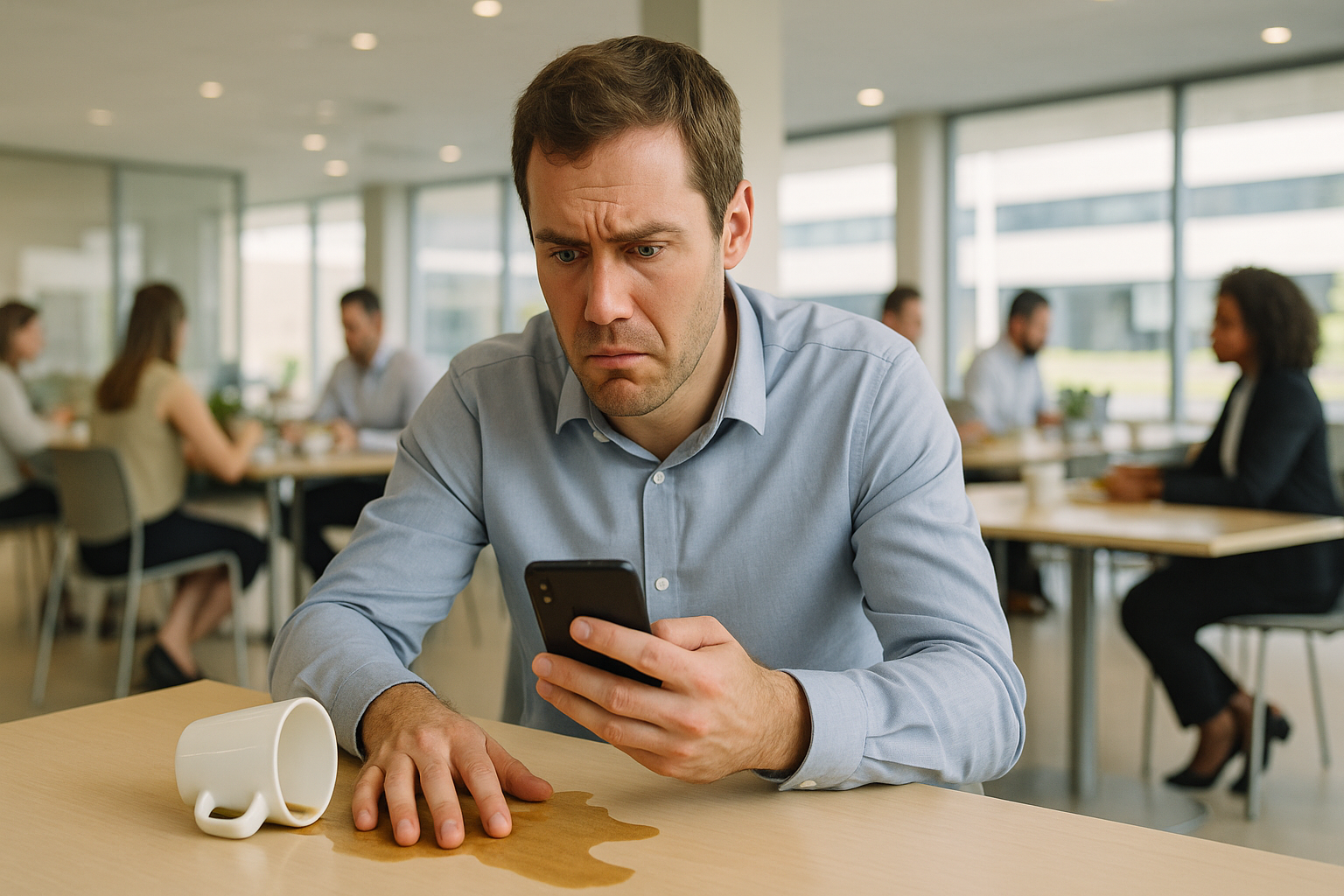 Jeg sad i kantinen, omgivet af folk med bakker og laptops. Nogen bag mig spøgte om deadlines. Mine hænder rystede så meget, at jeg knap kunne låse min telefon op.