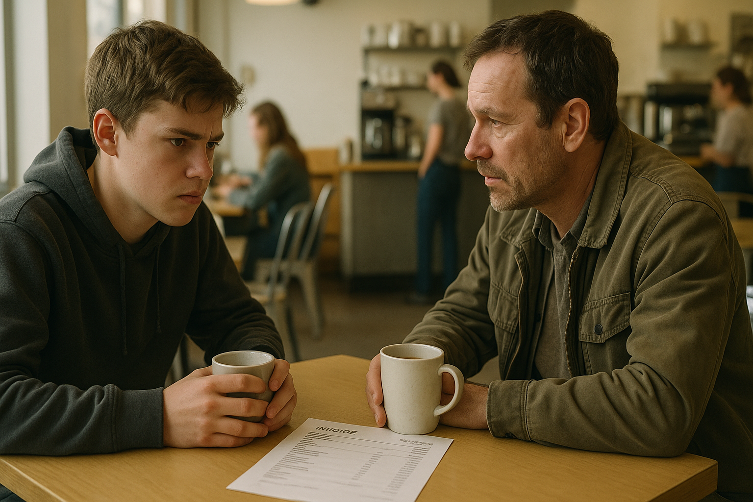 Vi gik til en billig café på den anden side af gaden. Lyse lamper, metalstole, lugten af brændt kaffe. Perfekt sted til at tale om ingenting vigtigt. Men han ville ikke tale om ingenting.