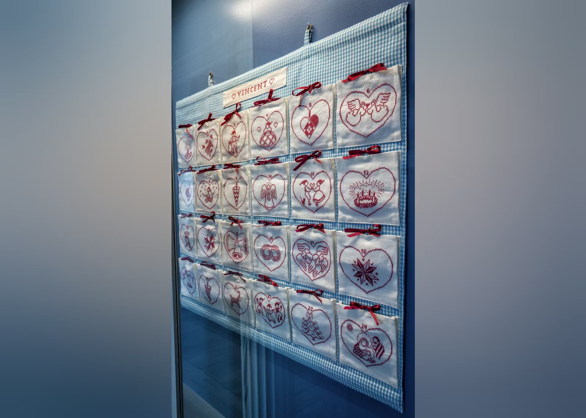 Resultatet blev et julehjerte-koncept, hvor hvert hjerte repræsenterer en dag i december. Over hvert motiv kan barnets navn broderes, og kalenderen kan genbruges år efter år. En løsning, som både børn og forældre har taget til sig.