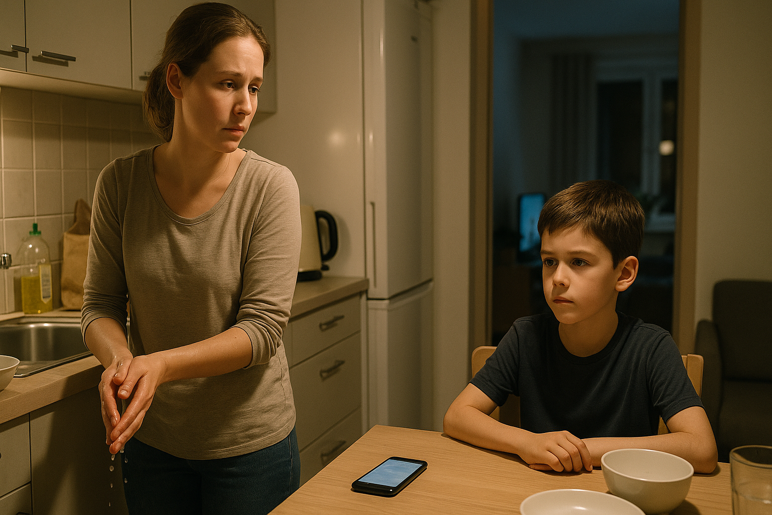 Det var en tirsdag aften. Jeg vaskede op, og fjernsynet summede i stuen. Mark var sent på den igen. Vores søn Leo, otte år gammel, kom ind i køkkenet med min telefon i hånden.