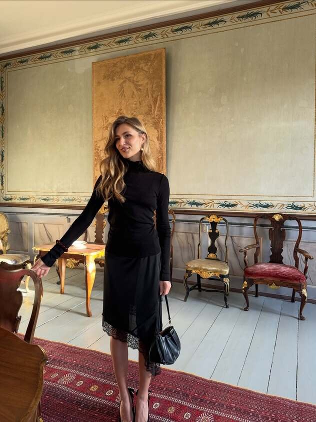 Selv i den kolde vinter opgav Benedikte ikke slip-nederdelen, en af sidste sommers stærkeste trends. Hun stylede den i uventede lag: en varm rullekravestrik, en satinskjorte med asymmetrisk tørklæde og en præcis blanding af teksturer, der spiller harmonisk sammen.