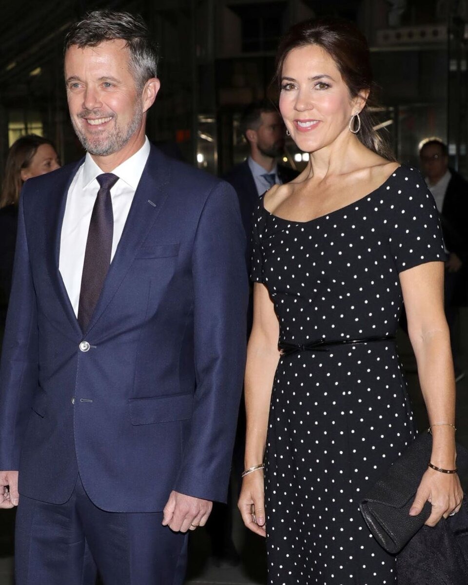 I denne uge blev den fælles smag igen tydelig. Marys nye Erdem-sæt består af en midnatsblå, figursyet blazer med markante blomstersyninger og en matchende pencil-nederdel. Silhuetten var skarp, feminin og tydeligt gennemtænkt. Hun fuldendte looket med lange støvler og en sort hårbøjle, der gav helheden et stramt og elegant udtryk.