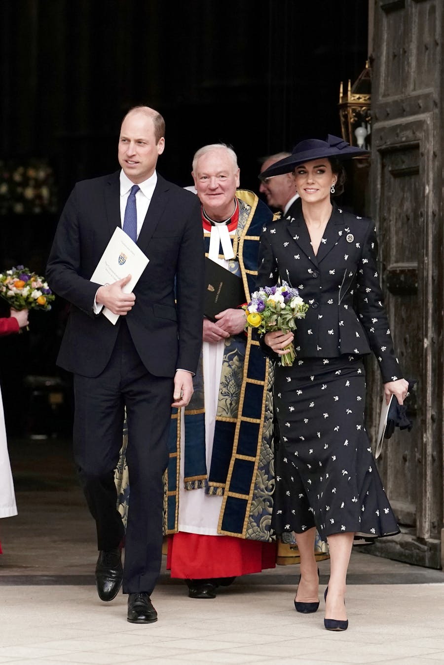 Prinsesse Kate valgte en lignende kombination, da hun deltog i den årlige Commonwealth Day Service sammen med resten af den britiske kongefamilie. Også her var det blazer og nederdel, og som hos Mary kunne man ane fine blomstersyninger og et flot peplum-snit på blazeren.