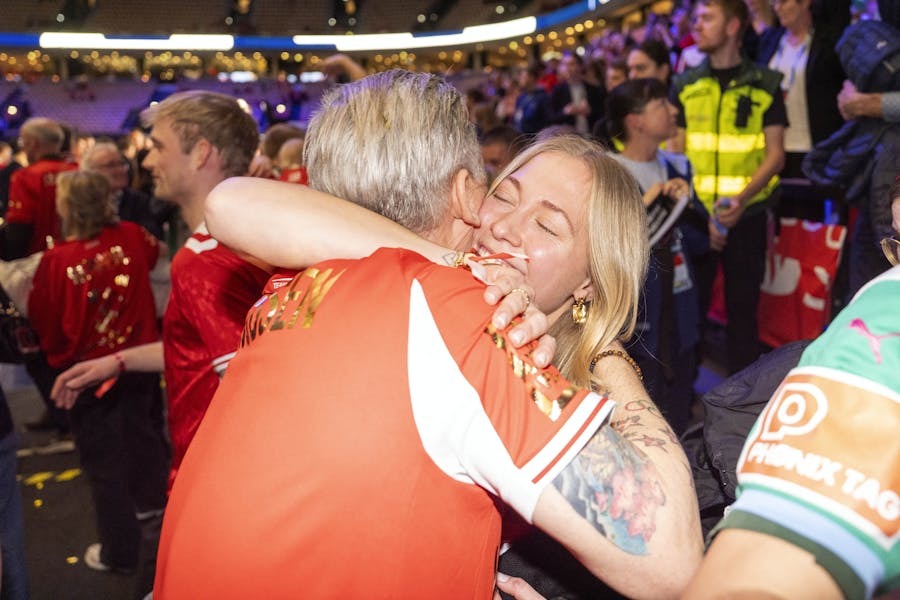 Jublen rullede som torden gennem Boxen Herning, da de danske håndboldherrer søndag aften sikrede sig EM-guldet. Spillere, stab og familier flød sammen på gulvet i et kaotisk, lykkeligt øjeblik, hvor kram og kys fløj i alle retninger.