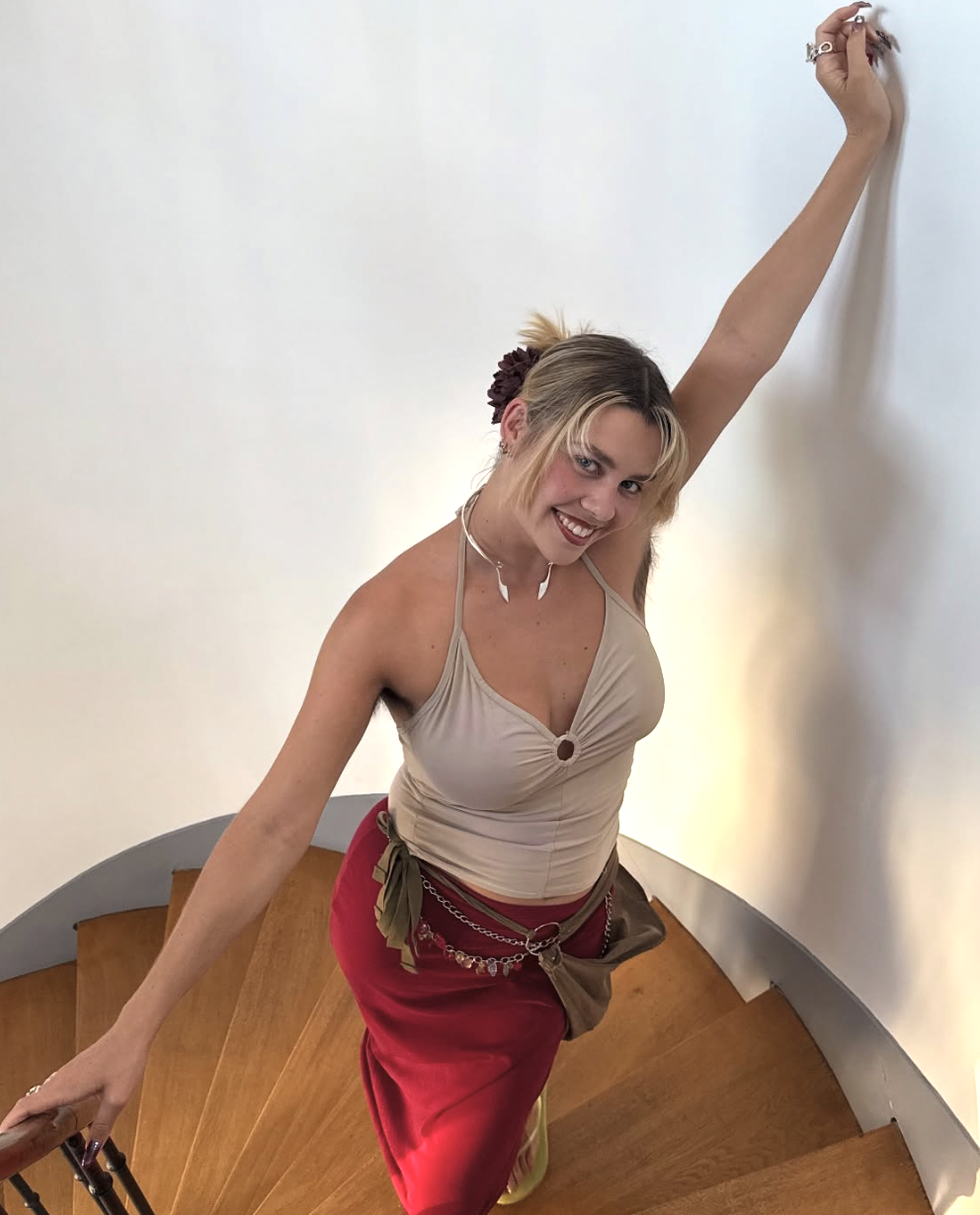 Midt i det bløde og drømmende sad et ildrødt satinkorset, der strammede taljen ind og skabte en markant kontrast. Det var dramatisk. Bevidst. Og umuligt at ignorere.