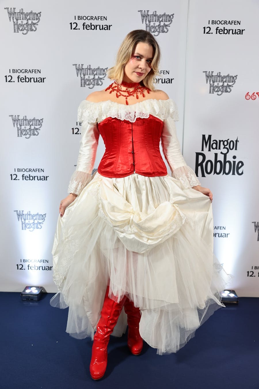 Den tidligere vært på Kender du typen? fuldendte outfittet med knaldrøde, højhælede lakstøvler, der spillede perfekt sammen med korsettet. Farven gik igen i både en markant rød halskæde og i øjenmakeuppen, som samlede looket i én stærk rød linje.