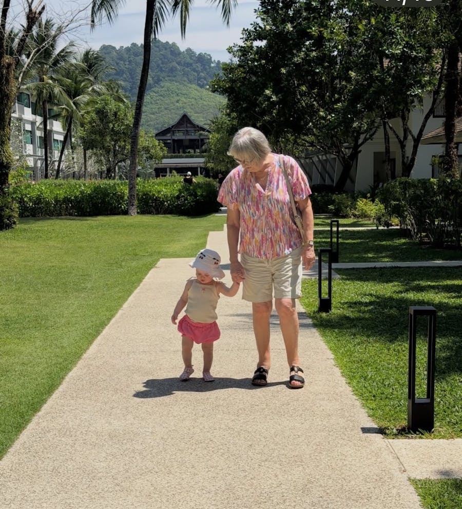 Også bedstemor Inge-Lise Kjeldgaard er med på rejsen og nyder hvert sekund med søn, svigersøn og de to små barnebarn. Det er familietid, når den er allerbedst – med sand mellem tæerne og grin, der overdøver bølgernes brusen.