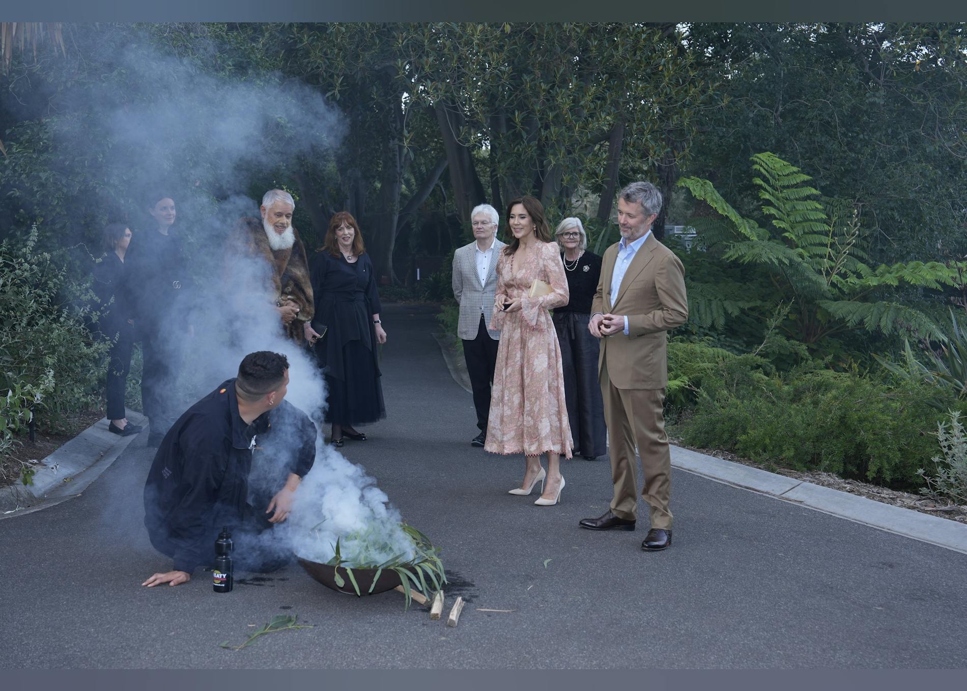 Da de ankom til returmiddagen i Melbourne’s Botaniske Have, var det ikke den typiske grillrøg, man kunne dufte, men derimod en traditionel røgceremoni, som var blevet omhyggeligt forberedt til den store aften. Den danske kongefamilie blev mødt med en helt unik og farverig tradition, der satte tonen for en aften fyldt med kulturel respekt og australsk gæstfrihed.
