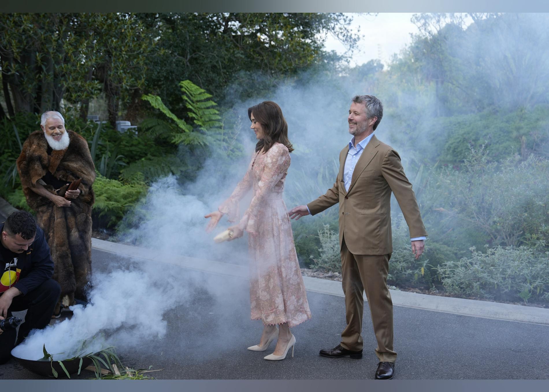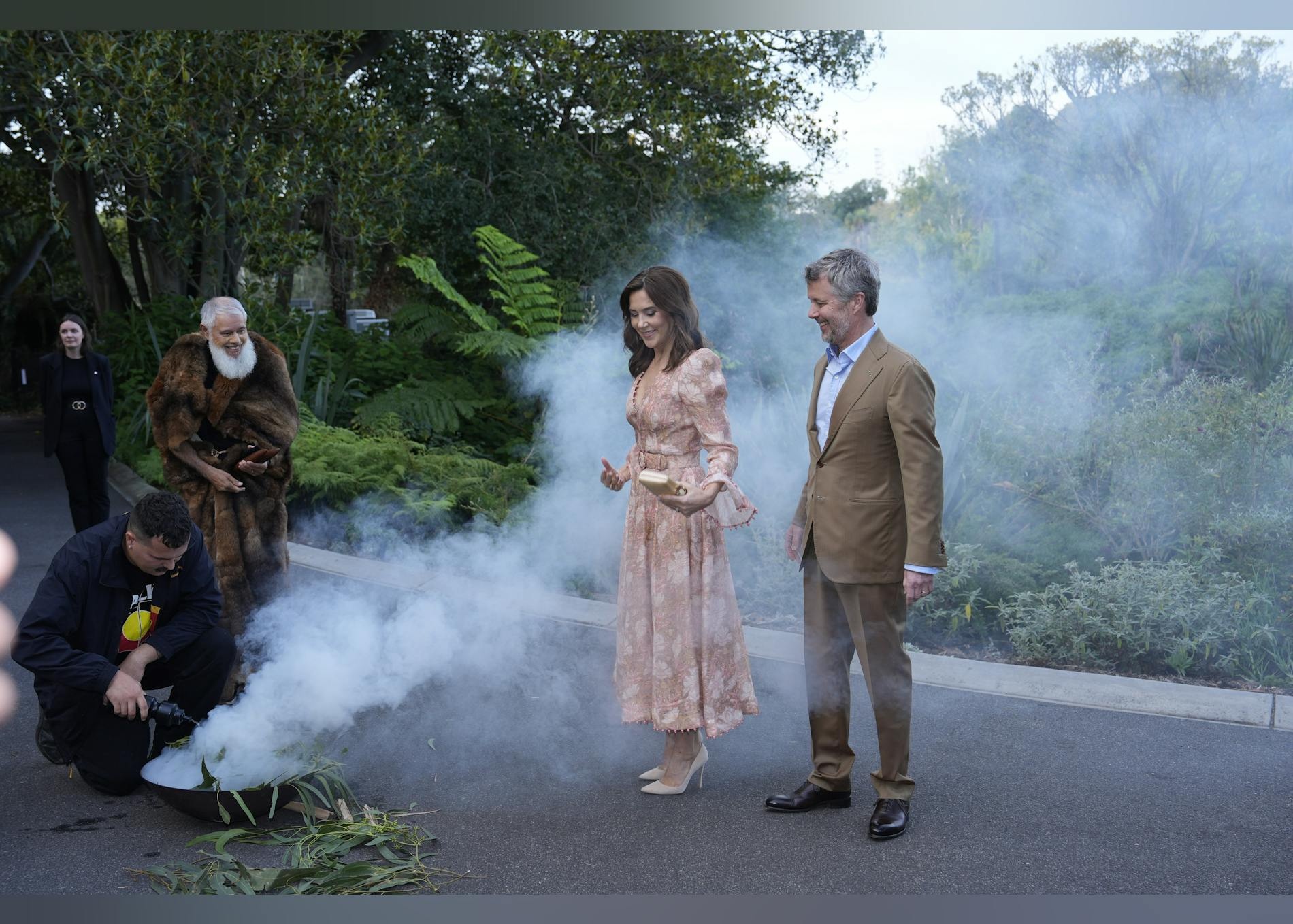 Mens australiere ofte er forbundet med afslappede grillfester og udendørs måltider, var det altså ikke en Weber-grill, der havde fået tingene til at ryge. I stedet stammede røgen fra en højt respekteret ritualceremoni, der er en vigtig del af Australiens oprindelige kulturer. Røgen symboliserer renselse og velkomst, og den var blevet en vigtig del af den officielle velkomst for kongeparret.