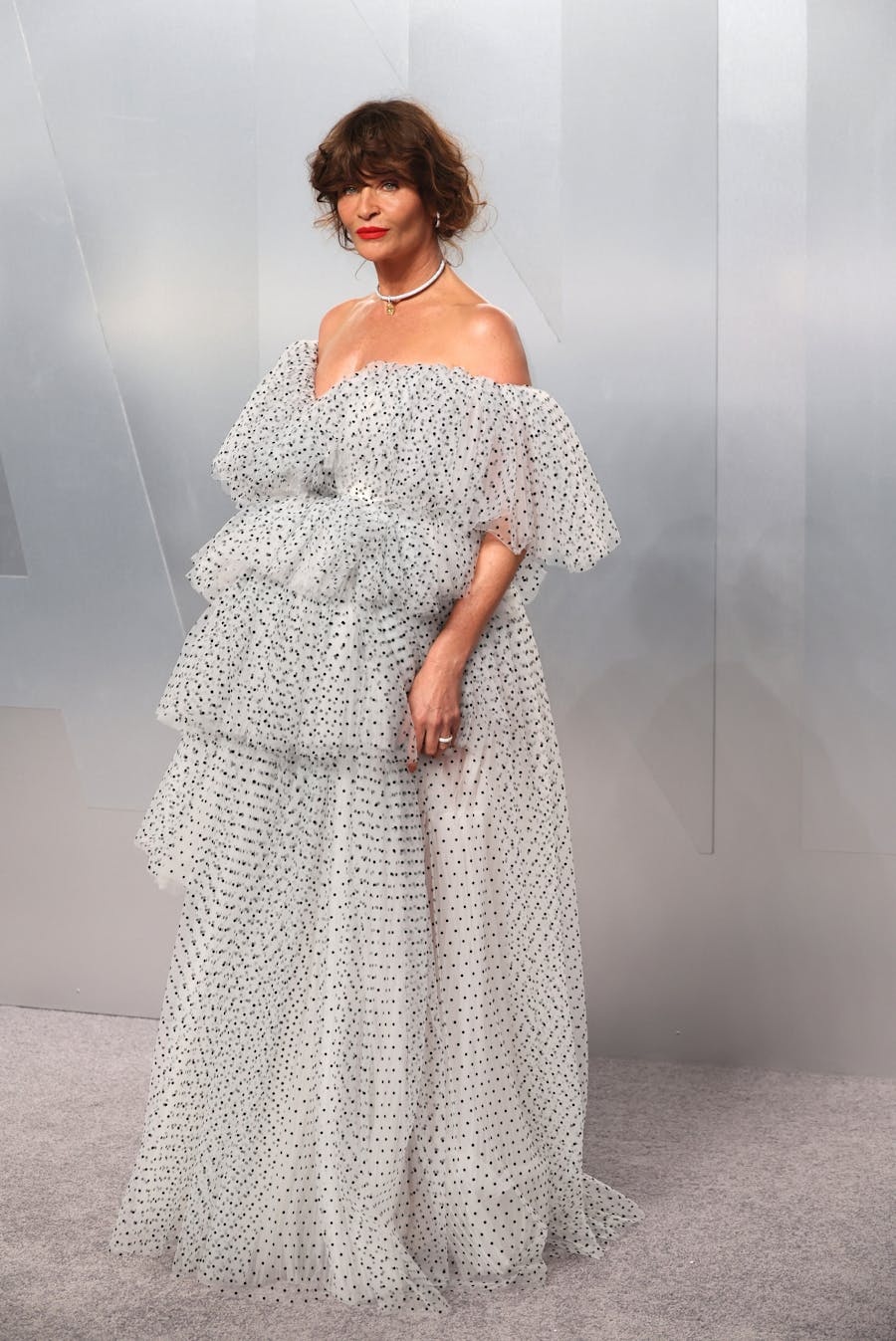 Den 57-årige model satte et imponerende præg på den sølvgrå løber, hvor hun bar en voluminøs stropløs tylkjole i flere lag, prydet med polkaprikker fra top til tå. Kjolens dramatiske udseende var både elegant og legende, og den fremhævede perfekt Helenas kendte charme og stil. Modellen, der stadig er et ikon inden for modeverdenen, beviste endnu en gang, at hendes sans for mode er tidløs og upåklagelig.