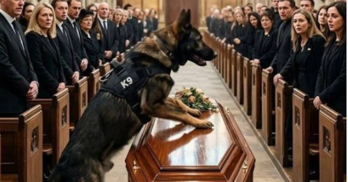 Alle i kirken frøs, da politihunden sprang frem og gøede desperat mod betjentens kiste, mens han nægtede at lade nogen komme tæt på.
