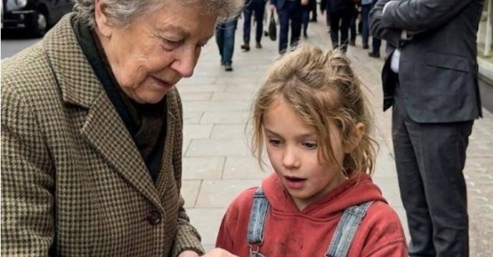 Hun kunne ikke være mere end ni. En alt for stor frakke hang løst på hendes spinkle krop, hendes tøj var slidt, hendes ansigt snavset. Hun gik stille mellem de perfekt dækkede borde, mens hvisken fulgte hende.