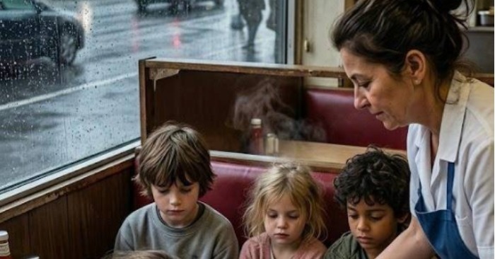 På en kold, regnvåd aften i en stille lille by fik en ung servitrice ved navn Emily Parker øje på noget, der fik hende til at standse brat. Lige udenfor dinerens glas stod fire små piger tæt presset sammen, mens de forsøgte at beskytte sig mod kulden. Deres tøj var tyndt og slidt, deres ansigter blege, og deres øjne bar på en tung, ordløs historie—en historie om sult, ensomhed og det at være fuldstændig glemt. I det øjeblik brast noget inde i Emily. Disse børn havde ingen—ingen familie, der ventede på dem, intet sikkert sted, ingen varme.