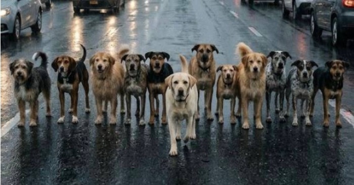 Tyve hunde stod på række midt på en bro, nægtede at flytte sig en eneste centimeter og blokerede fuldstændigt trafikken i begge retninger. En voksende kø af biler strakte sig langt bag dem, mens hornene gjaldede uden stop, og frustrationen steg på begge sider.