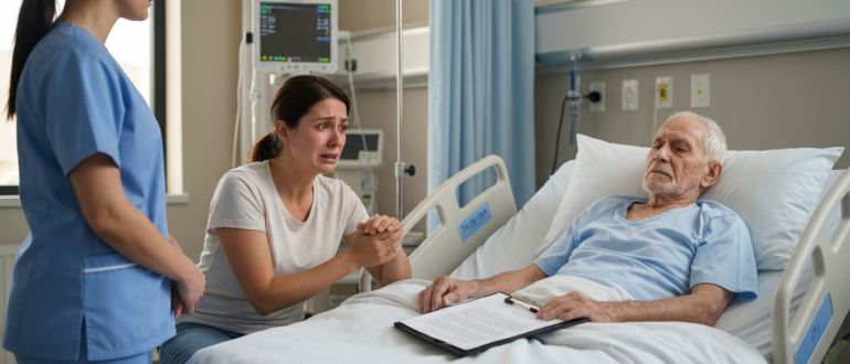 Sygeplejersken hviskede ”Far, skriv under her” og skubbede papirerne hen mod ham, men den gamle mands hænder rystede blot over linjen, hvor der stod HAN AFVISER YDERLIGERE BEHANDLING.