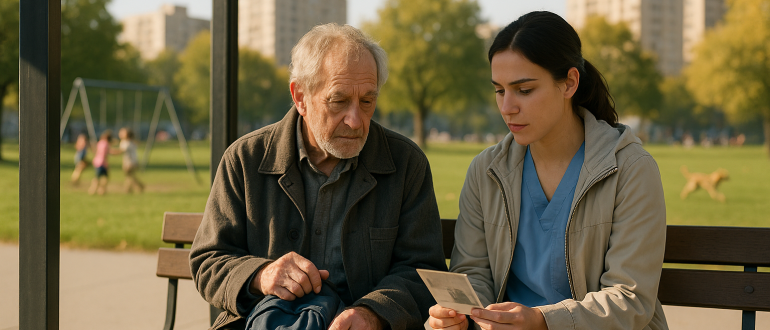 Den gamle mand blev ved med at sidde på den samme bænk i parken hver dag med en lille blå rygsæk, indtil en regnfuld eftermiddag en fremmed åbnede
