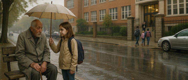 Den gamle mand blev ved med at stirre på skoleporten hver eftermiddag, indtil en regnfuld dag, hvor en pige endelig gik hen til ham og stillede det spørgsmål,