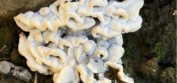 Billedet viser en usædvanlig organisme, der sidder tæt fast på en træstamme, lige der hvor rødderne smelter sammen med jorden. Det er formodentlig en svamp. Dens uregelmæssige form
