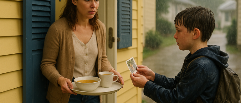 Drengen ved min dør insisterede vedvarende på, at jeg var hans mor, og det foto, han viste mig, fik mig næsten til at tabe bakken fra mine hænder.